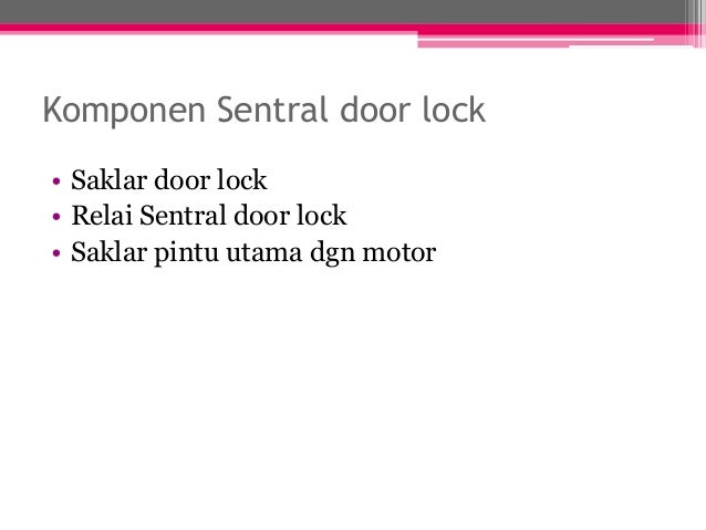 - 10. Sentral door lock• Sentral door lock merupakan sistem terpusat dalam control penguncian pintu. Sistem kontrol mengunci pintu tidak hanya masalah bekerjanya pintu terkunci atau tidak namun juga berbicara masalah kelistrikannya. Sistem control penguncian ada juga yang mempunyai fungsi untuk mendeteksi kunci tertinggal dalam kendaraan. Fungsi ini ditopang oleh pelbagai sistem ter-gantung model, gan golongan/kelas.