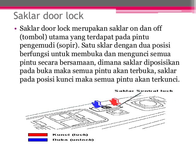 - 12. Saklar door lock• Saklar door lock merupakan saklar on dan off (tombol) utama yang terdapat pada pintu pengemudi (sopir). Satu sklar dengan dua posisi berfungsi untuk membuka dan mengunci semua pintu secara bersamaan, dimana saklar diposisikan pada buka maka semua pintu akan terbuka, saklar pada posisi kunci maka semua pintu akan terkunci.