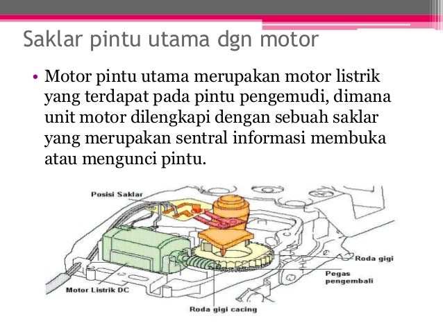 - 13. Saklar pintu utama dgn motor• Motor pintu utama merupakan motor listrik yang terdapat pada pintu pengemudi, dimana unit motor dilengkapi dengan sebuah saklar yang merupakan sentral informasi membuka atau mengunci pintu.