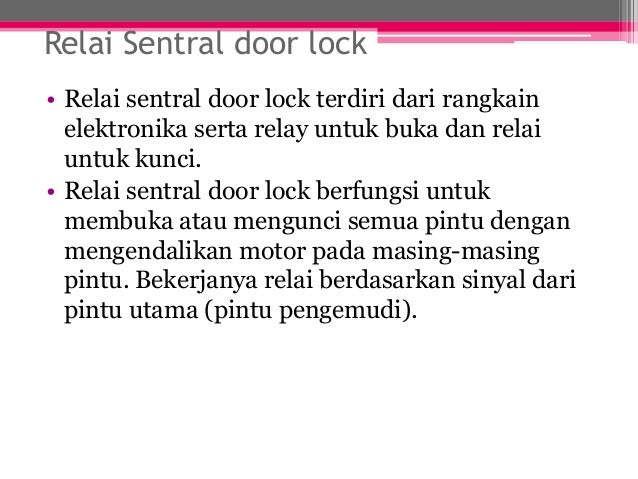 - 14. Relai Sentral door lock• Relai sentral door lock terdiri dari rangkain elektronika serta relay untuk buka dan relai untuk kunci.• Relai sentral door lock berfungsi untuk membuka atau mengunci semua pintu dengan mengendalikan motor pada masing-masing pintu. Bekerjanya relai berdasarkan sinyal dari pintu utama (pintu pengemudi).