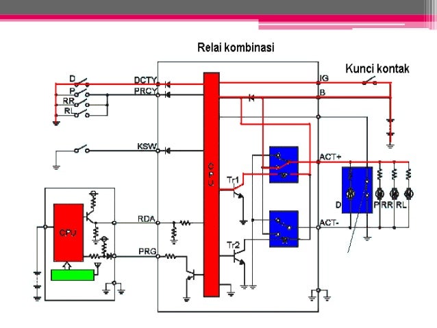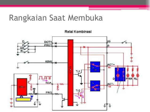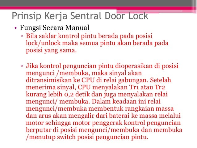 - 15. Prinsip Kerja Sentral Door Lock• Fungsi Secara Manual ▫ Bila saklar kontrol pintu berada pada posisi lock/unlock maka semua pintu akan berada pada posisi yang sama. ▫ Jika kontrol penguncian pintu dioperasikan di posisi mengunci /membuka, maka sinyal akan ditransimisikan ke CPU di relai gabungan. Setelah menerima sinyal, CPU menyalakan Tr1 atau Tr2 kurang lebih 0,2 detik dan juga menyalakan relai mengunci/ membuka. Dalam keadaan ini relai mengunci/membuka membentuk rangkaian massa dan arus akan mengalir dari baterai ke massa melalui motor sehingga motor penggerak kontrol penguncian berputar di posisi mengunci/membuka dan membuka /menutup switch posisi penguncian pintu.