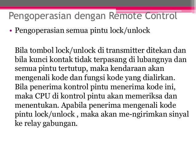 - 16. Pengoperasian dengan Remote Control• Pengoperasian semua pintu lock/unlock Bila tombol lock/unlock di transmitter ditekan dan bila kunci kontak tidak terpasang di lubangnya dan semua pintu tertutup, maka kendaraan akan mengenali kode dan fungsi kode yang dialirkan. Bila penerima kontrol pintu menerima kode ini, maka CPU di kontrol pintu akan memeriksa dan menentukan. Apabila penerima mengenali kode pintu lock/unlock , maka akan me-ngirimkan sinyal ke relay gabungan.