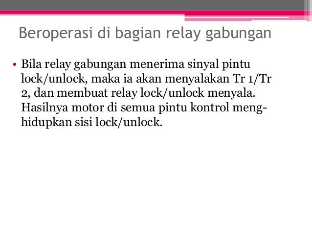 - 17. Beroperasi di bagian relay gabungan• Bila relay gabungan menerima sinyal pintu lock/unlock, maka ia akan menyalakan Tr 1/Tr 2, dan membuat relay lock/unlock menyala. Hasilnya motor di semua pintu kontrol meng- hidupkan sisi lock/unlock.