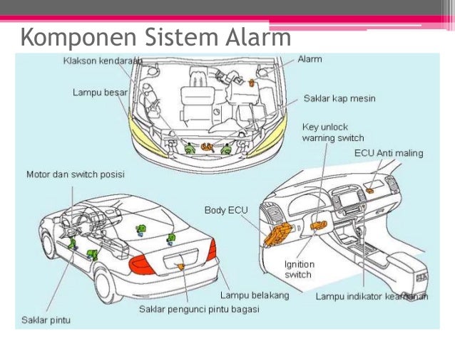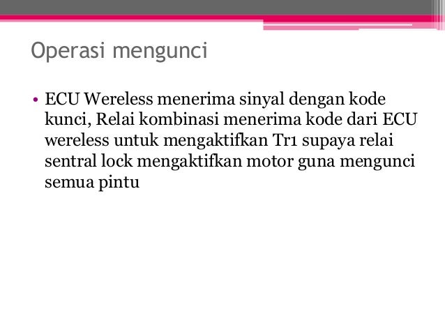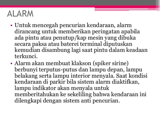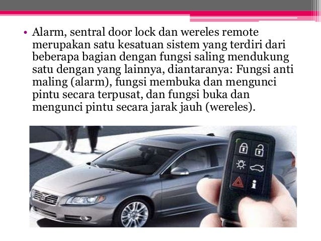 - 2. • Alarm, sentral door lock dan wereles remote merupakan satu kesatuan sistem yang terdiri dari beberapa bagian dengan fungsi saling mendukung satu dengan yang lainnya, diantaranya: Fungsi anti maling (alarm), fungsi membuka dan mengunci pintu secara terpusat, dan fungsi buka dan mengunci pintu secara jarak jauh (wereles).