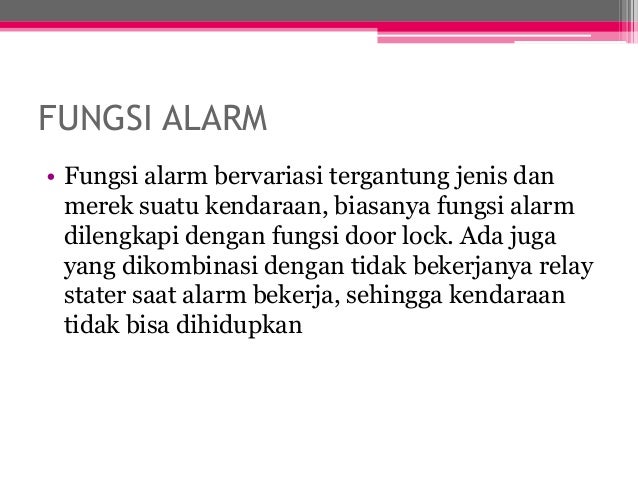 - 4. FUNGSI ALARM• Fungsi alarm bervariasi tergantung jenis dan merek suatu kendaraan, biasanya fungsi alarm dilengkapi dengan fungsi door lock. Ada juga yang dikombinasi dengan tidak bekerjanya relay stater saat alarm bekerja, sehingga kendaraan tidak bisa dihidupkan