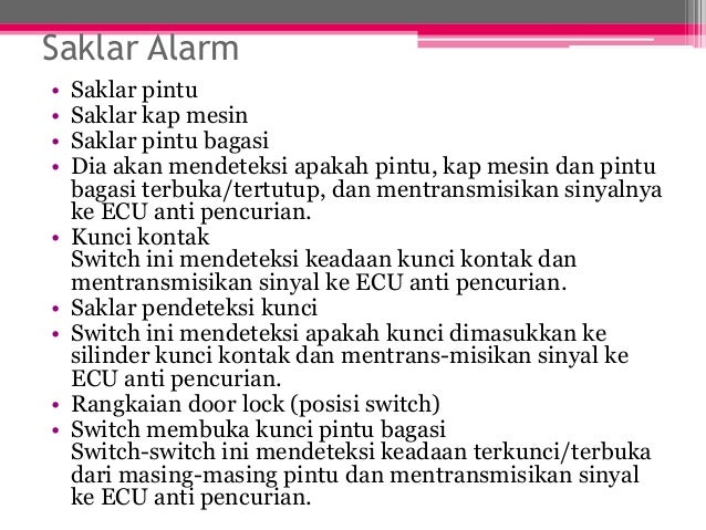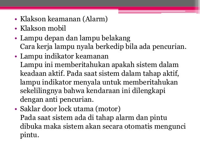 - 8. • Klakson keamanan (Alarm)• Klakson mobil• Lampu depan dan lampu belakang Cara kerja lampu nyala berkedip bila ada pencurian.• Lampu indikator keamanan Lampu ini memberitahukan apakah sistem dalam keadaan aktif. Pada saat sistem dalam tahap aktif, lampu indikator menyala untuk memberitahukan sekelilingnya bahwa kendaraan ini dilengkapi dengan anti pencurian.• Saklar door lock utama (motor) Pada saat sistem ada di tahap alarm dan pintu dibuka maka sistem akan secara otomatis mengunci pintu.